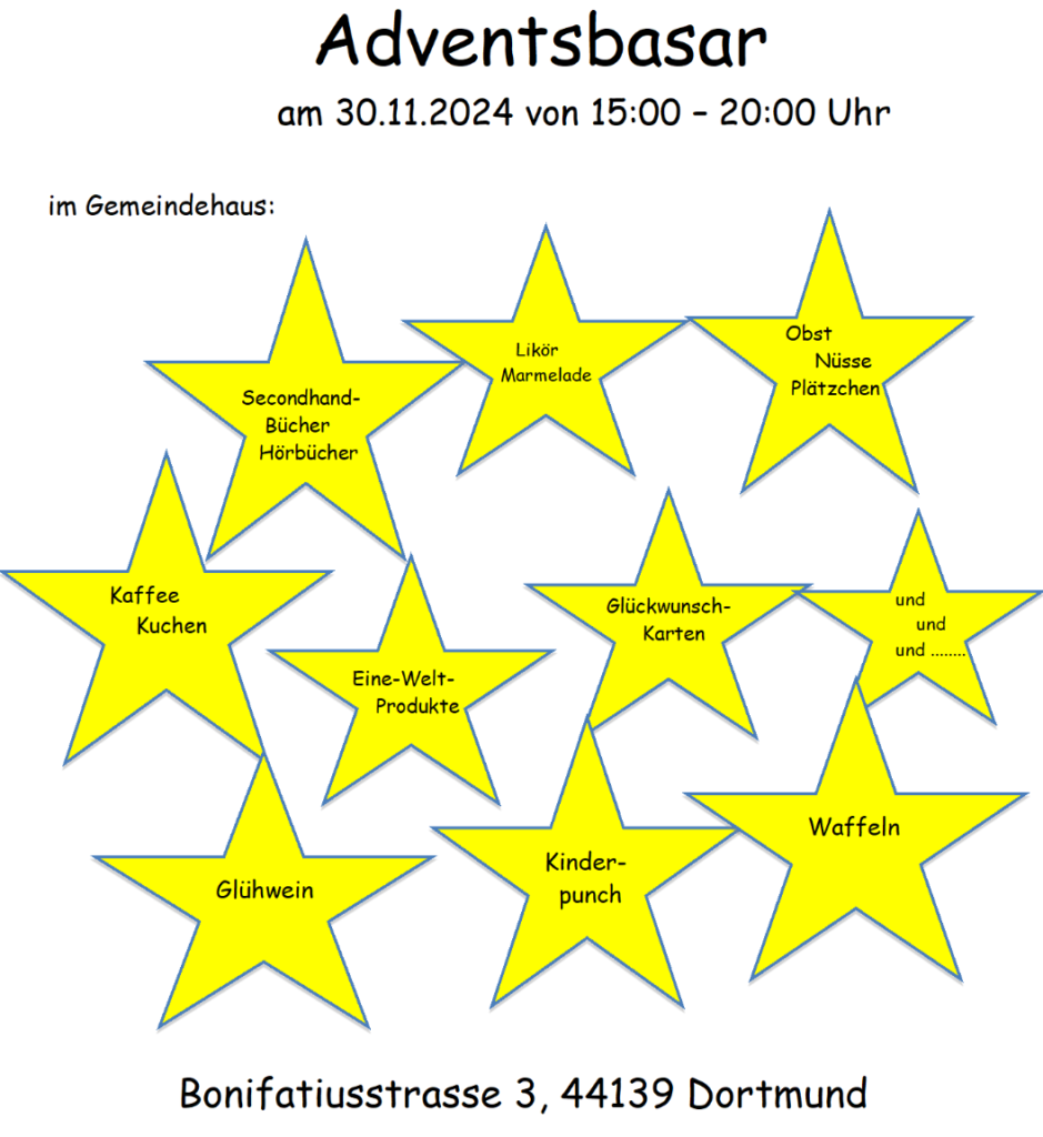 Jeden Dienstag im Dezember um 18:00 Uhr mit anschließendem Zusammensein auf dem Kirchplatz. Mit den Roratemessen wollen wir auch uns innerlich im Advent auf die Ankunft Gottes bei uns vorbereiten. Wärmende Getränke werden angeboten. An nahezu jedem Sonntag laden die christlichen Gemeinden der Dortmunder Innenstadt zu Kaffee und Kuchen, belegten Broten, Gesprächen und Gesang ein. Neben dem Frühstück erleben Wohnungslose und Bedürftige hier Gemeinschaft und es gibt die Möglichkeit zu Gesprächen und Austausch.