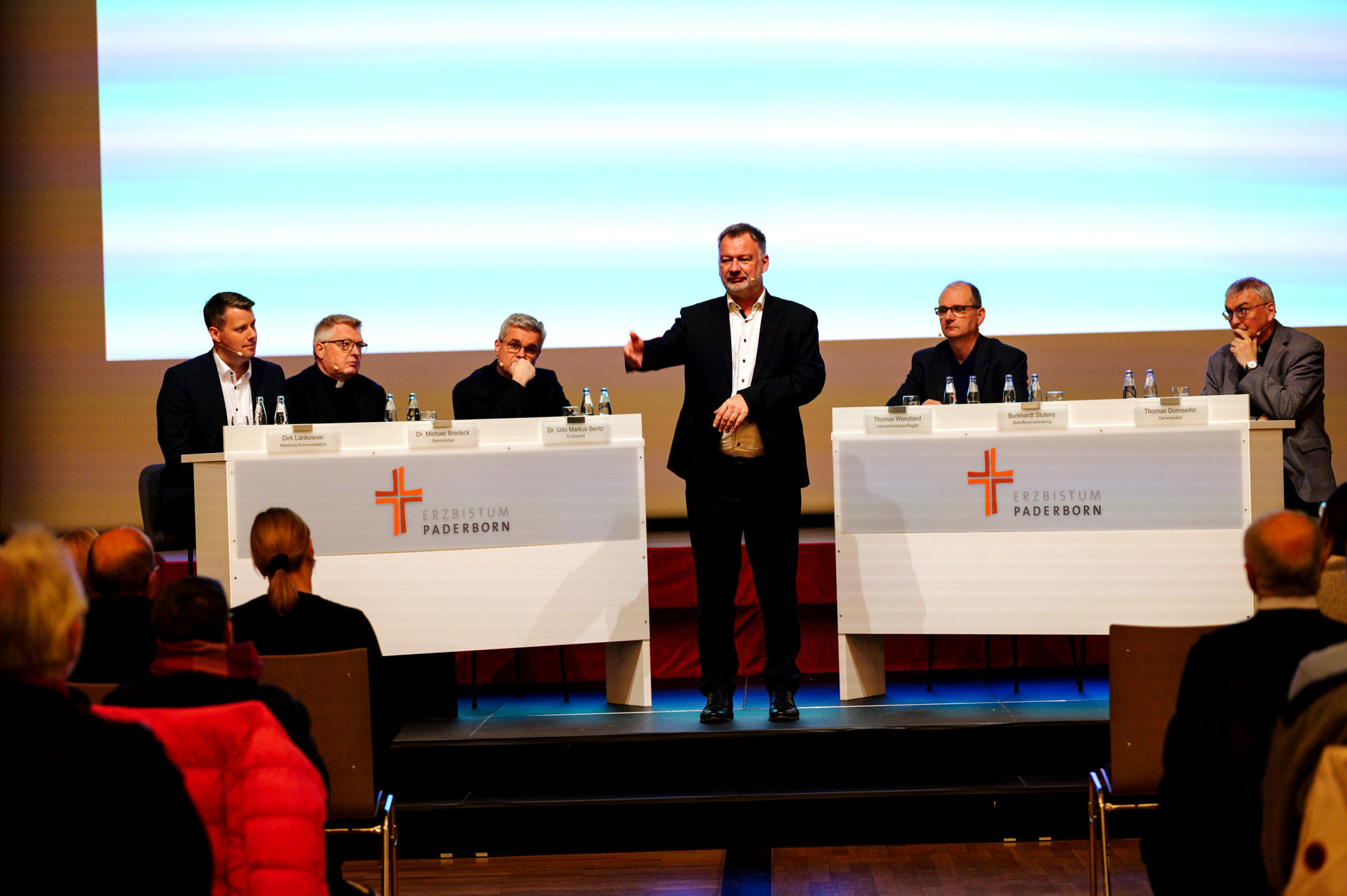 Erzbischof Dr. Udo Markus Bentz, die Generalvikare Thomas Dornseifer und Dr. Michael Bredeck, der Interventionsbeauftragte Thomas Wendland sowie Mitglieder der Betroffenenvertretung stellten sich den Fragen der Teilnehmenden und suchten bewusst den direkten Dialog. Ziel war es, Raum auch für sehr persönliche Rückmeldungen zu schaffen und die unterschiedlichen Perspektiven wahrzunehmen. Zugleich wurde deutlich, dass die Aufarbeitung nicht mit der Veröffentlichung der Studie abgeschlossen ist, sondern als fortlaufender Prozess verstanden wird. (Weitere Informationen dazu unter www.erzbistum-paderborn.de/aufarbeitung )ch zu kommen. Im Mittelpunkt stand dabei der offene Austausch über Fragen, Erwartungen und persönliche Resonanzen.