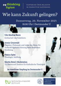 Am Donnerstag, den 20.11.2025 findet im Dortmunder U eine Podiumsdiskussion statt, organisiert von der Theologischen Fakultät Paderborn und der Professur für Systematische Theologie an der TU Dortmund. Die Podiumsdiskussion ist Teil der größeren Veranstaltungsreihe „rethinking religion. Gespräche über Religion im Erzbistum Paderborn". Im Rahmen der Veranstaltungsreihe bietet das Erzbistum Paderborn ein Diskussionsforum zu aktuellen Fragen, die von gesellschaftlicher Bedeutung sind. Die nun anstehende Ausgabe der Religionsgespräche widmet sich der Frage: „Wie kann Zukunft gelingen?".