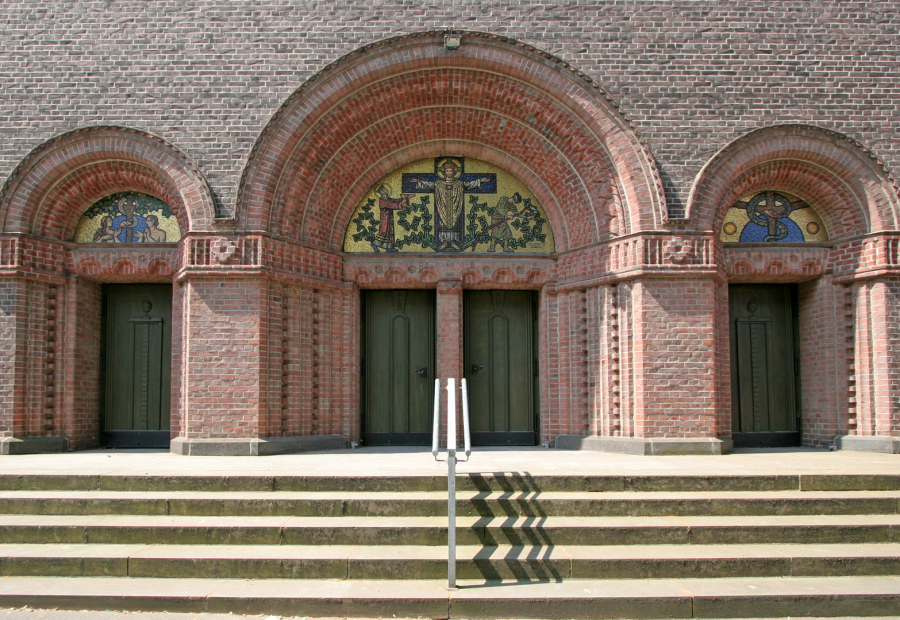 Aufgrund dieses Zitats wurden Christen und Juden in der Kunstgeschichte jahrhundertelang durch zwei Frauenfiguren dargestellt, so auch hier: Das neue Gottesvolk der Christen als triumphierende Frau – oft mit einem Kelch als Symbol für den neuen Bund durch Christi Blut; das verworfene jüdische Volk als Frau mit verbundenen Augen („blind“ für den Messias Jesus) oder als vermeintliche Gottesmörder fortgeschickt vom Kreuz mit gekrümmtem Rücken und zerbrochenem Stab. Gerade durch diese weitverbreitete Darstellung wurden der Antijudaismus und letztlich der Antisemitismus in all ihren Ausformungen durch die Zeiten lebendig gehalten, gefördert und gerechtfertigt. Der sogenannte Holocaust, die Schoa, mit der grausamen Vernichtung von 6 Millionen Juden ist der entsetzliche Gipfel dieser Entwicklung. Als das Mosaik 1916 gestaltet wurde, war der Antisemitismus in Deutschland weit verbreitete Geisteshaltung.